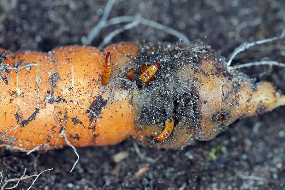 Los gusanos de alambre, principalmente de las especies Agriotes spp., se alimentan de las raíces de varios cultivos, incluyendo la zanahoria, lo que resulta en raíces perforadas y deformadas, afectando tanto el rendimiento como el valor comercial del producto.