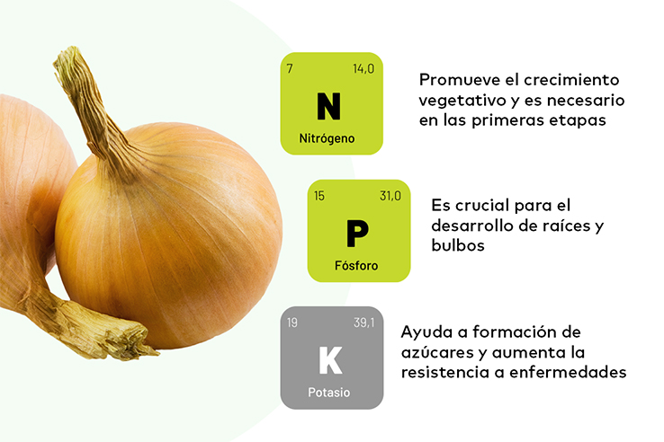 Para que las cebollas se desarrollen adecuadamente, necesitan un equilibrio entre macronutrientes, micronutrientes y elementos secundarios.
