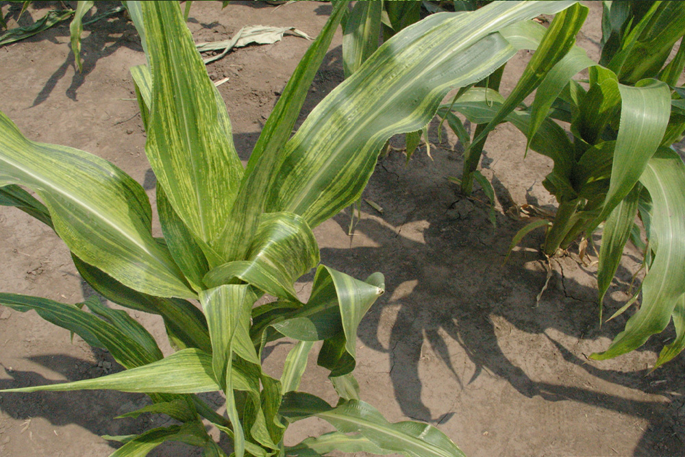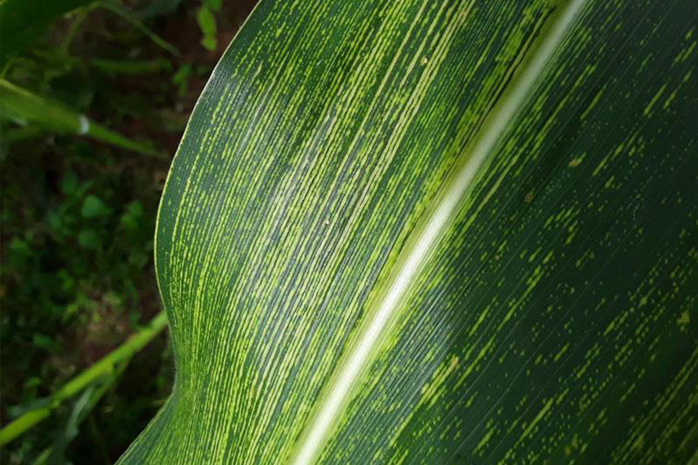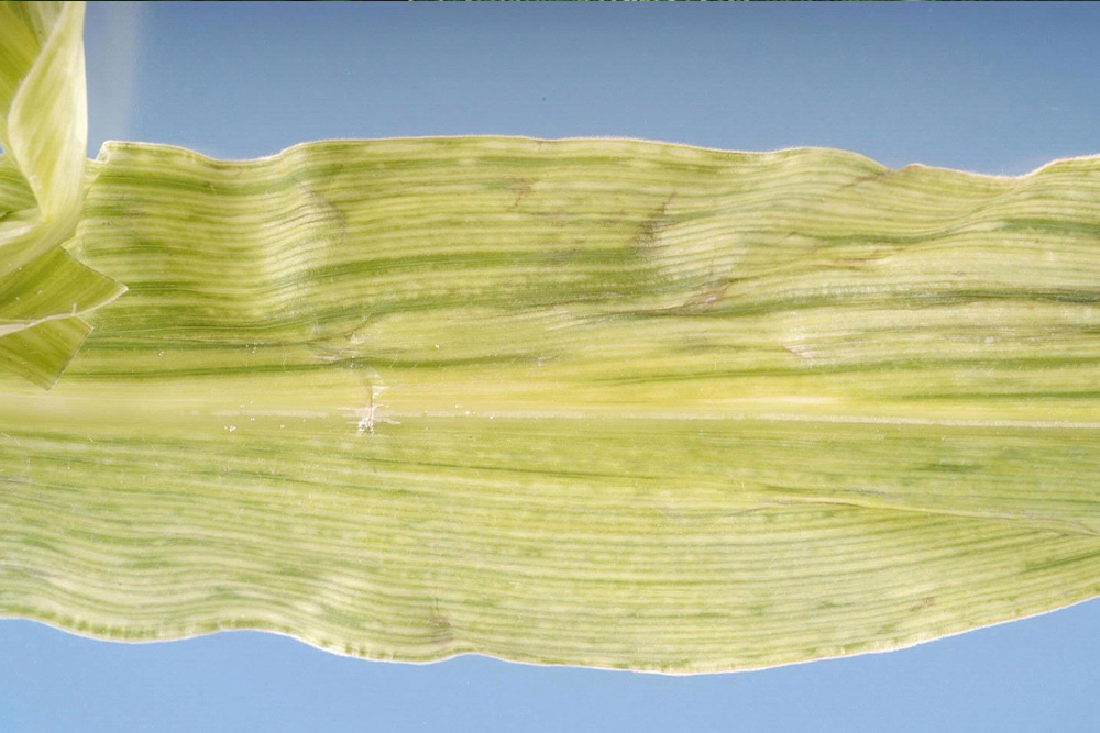 También transmitido por Dalbulus maidis, MRFV provoca punteado clorótico a lo largo de las venas, que evoluciona a estrías finas y clorosis generalizada.